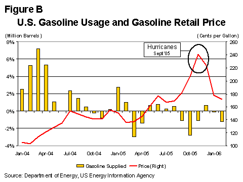 shows the drop in the consumption of gasoline as prices peaked after Katrina